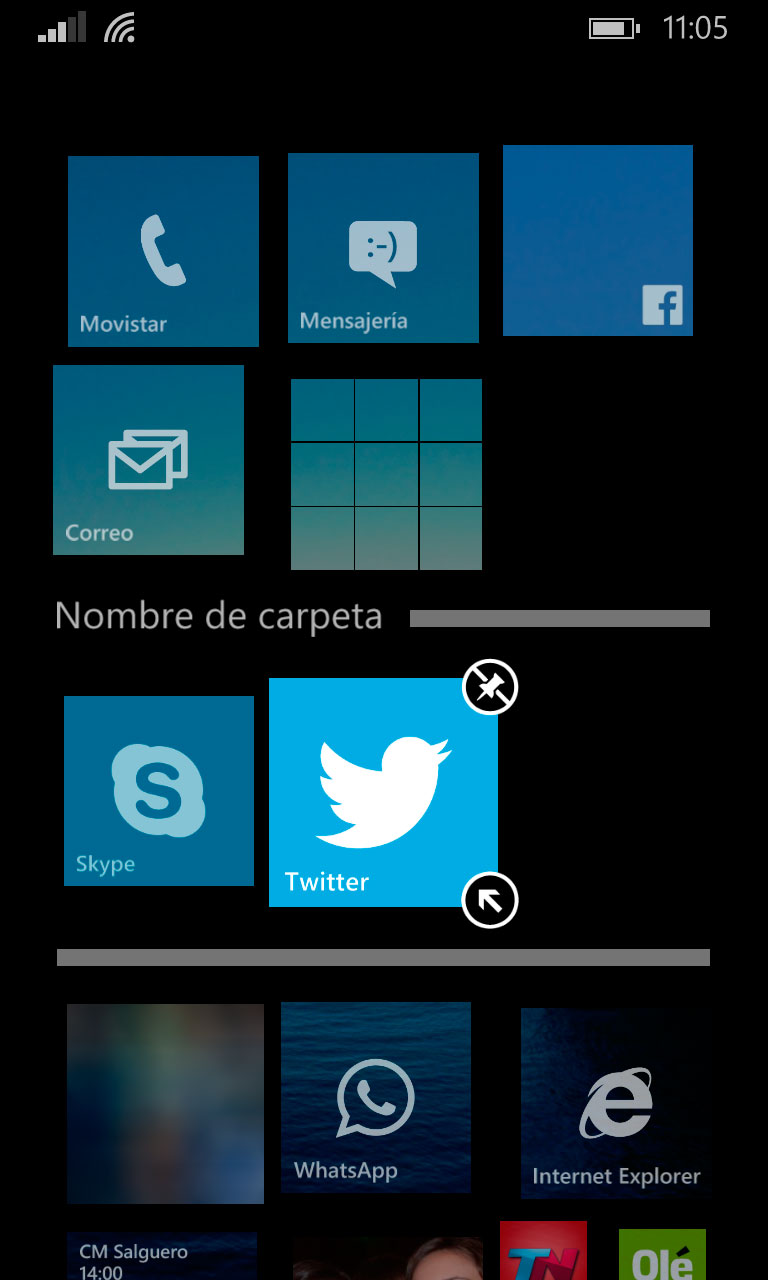 Arrástralo sobre otro tile que quisieras incluir en la misma carpeta y entonces verás que aparece una nueva sección en tu pantalla. En este ejemplo, arrastré Twitter sobre Skype