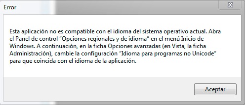 «Esta aplicación no es compatible con el idioma del sistema operativo actual. Abra el Panel de control ‘Opciones regionales y de idioma’ en el menú de Inicio de Windows. A continuación, en la ficha Opciones avanzadas (en Vista, la ficha Administración), cambie la configuración ‘Idioma para programas no Unicode’ para que coincida con el idioma de la aplicación.»