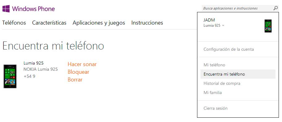 A partir de ahora, cuando sea necesario, entramos desde cualquier navegador a windowsphone.com, ingresamos con nuestros datos y, en el menú Mi teléfono vamos a Encuentra mi teléfono. Y ahí podemos: