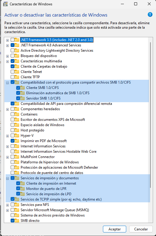 - Allí tenes que activar los protocolos SMB 1, los servicios de impresión y los servicios de TCPIP simple. Tendría que quedarte así: